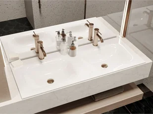 Podwójna umywalka meblowa JESSEL 1100-2 z lanego marmuru to optymalne rozwiązanie dla dużej rodziny. Płynne linie misek zapobiegają rozpryskiwaniu wody, a sz...