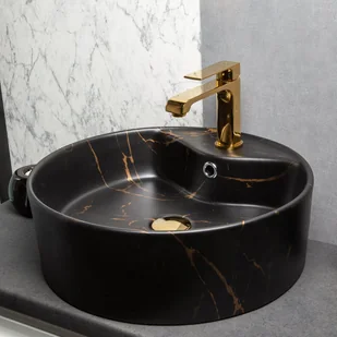 Umywalka z serii KR-138 w czarno złotym wykończeniu wyróżnia się oryginalnym kształtem oraz wzorem, który stanie się ozdobą w Twojej łazienki. Wyposażona została w otwór na baterię oraz przelew, dzięki czemu możemy zaoszczędzić miejsce na blacie łązienkowym. Oryginalne wykończenie - wzór marmuru - doskonale będzie się komponowało z czarną lub złotą armaturą.