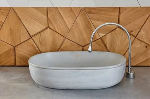 Umywalka betonowa model V_4 w kolorze jasnoszarym. To model umywalki betonowej montowanej na blat. Szerokość 42 cm i długość 60cm, a głębokość misy 14 cm. Wszystkie elementy wykonujemy ręcznie, w estetycznej klasie betonu architektonicznego. Technicznie to wysoko wytrzymałe betony GRC.