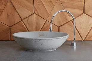 Umywalka betonowa model V_6 w kolorze jasnoszarym. To model umywalki betonowej montowanej na blat. Klasyczny kształt na planie elipsy o długości boków 53cm/33 cm, z miękko zwężanymi do dołu ściankami. Głębokość misy to 14 cm. Wszystkie elementy wykonujemy ręcznie, w estetycznej klasie betonu architektonicznego.