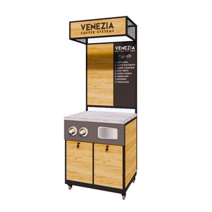 Ekspozytor Venezia to świetne rozwiązanie na atrakcyjne wyeksponowanie ekspresu do kawy w biurze, gastronomii, hotelu, czy na stacji benzynowej. Stand posiada dwa użytkowe rękawy na papierowe kubki, wmontowany śmietniczek i blat o wymiarach 80 na 60 cm, który pozwala na pomieszczenie wydajnego ekspresu razem z chłodziarką. Dzięki dwóm zamykanym na klucz szafkom pod ekspresem możemy wygodnie składować dodatkowe akcesoria, kawę kubeczki i środki do konserwacji ekspresu. Mebel posiada kółka, które pozwalają na szybkie i bezproblemowe przemieszczenie całego zestawu.