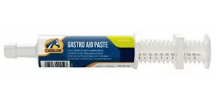 Suplement w paście wspierający pracę układu pokarmowego GASTRO AID 6x50 g - CAVALORTworzy zdrowe środowisko w żołądku z naciskiem na neutralizację kwasu żołądkowego i ochronęściany żołądka. W żołądku konia kwas żołądkowy jest wytwarzany przez całą dobę. W rezultacie żołądek konia jest bardzo podatny na powstawanie ran i wrzodów. Zioła zawarte w Cavalor Gastro Aid (Pasta) zapewniają niezbędną ochronę ściany żołądka przed nadmiarem kwasu żołądkowego. Aby zapewnić dodatkową pomoc dla żołądka, stymulują wytwarzanie śliny i pomagają w odbudowie ściany żołądka po wszelkich wrzodach.