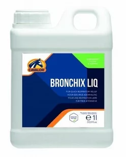 Syrop na drogi oddechowe BRONCHIX LIQUID 1l - CAVALORPomaga szybko oczyścić i ukoić podrażnione drogi oddechowe. Zapewnia szybką ulgę w przypadku trudności w oddychaniu wpływających na górne drogi oddechowe, w szczególności ból gardła lub śluz powstały w wyniku podrażnienia. Zawiera mieszankę ekstraktów roślinnych, które ułatwiają oddychanie oraz łagodzą drogi oddechowe, między innymi: sosnę zwyczajną, eukaliptus, oregano i rozmaryn, które są znane ze swoich wykrztuśnych i kojących właściwości. Składniki te ułatwiają nie tylko oddychanie konia, ale mają także korzystny wpływ na cały układ oskrzeli.