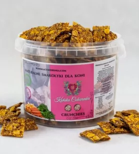 Ciasteczka - crunchies100% naturalnych składników0% cukruCienkie i kruche ciasteczka dla koni, idealne jako nagroda. Z łatwością zmieszczą się do kieszeni. Uwielbiane przez konie, na pewno zaspokoją najbardziej wybredne końskie (i nie tylko) podniebienia. Wyrabiane ręcznie tradycyjnym, domowym sposobem. Skład: 50% świeża marchew, płatki owsiane, płatki kukurydziane, otręby pszenne, siemię lniane, olej sojowy, mąka kukurydziana.