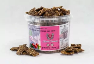 Ciasteczka - jabłko z miętą100% naturalnych składników0% cukruCienkie i kruche ciasteczka dla koni, idealne jako nagroda. Z łatwością zmieszczą się do kieszeni. Uwielbiane przez konie, na pewno zaspokoją najbardziej wybredne końskie (i nie tylko) podniebienia. Wyrabiane ręcznie tradycyjnym, domowym sposobem. Skład: 50% świeże jabłka, płatki owsiane, otręby pszenne, siemię lniane, olej sojowy, mąka kukurydziana, mięta.