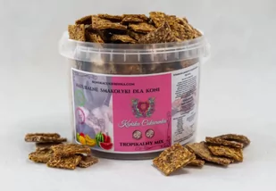 Ciasteczka - tropikalny mix ( mango,banan,arbuz)100% naturalnych składników0% cukruCienkie i kruche ciasteczka dla koni, idealne jako nagroda. Z łatwością zmieszczą się do kieszeni. Uwielbiane przez konie, na pewno zaspokoją najbardziej wybredne końskie (i nie tylko) podniebienia. Wyrabiane ręcznie tradycyjnym, domowym sposobem. Skład: 50% świeże banany, arbuz, jabłka i mango (świeże lub pulpa bez dodatku cukru), płatki owsiane, otręby pszenne, siemię lniane, olej sojowy, mąka kukurydziana.