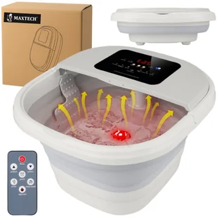 Masażer do stóp wodny Hydromasażer Składany Podgrzewany z bąbelkami + pilot MAXTECH®-S2 - Twoje Prywatne SPA w Zasięgu Ręki Czy marzysz o chwili prawdziwego relaksu po długim, męczącym dniu ? Twoje stopy zasługują na luksus i odprężenie, które możesz mieć na wyciągnięcie ręki, bez wychodzenia z domu. Masażer do Stóp MAXTECH®-S2 - osobiste SPA, które zadba o Twój komfort i regenerację. kiedy tylko tego potrzebujesz 8 stref masażu - maksymalny efekt Wbudowane: wałki masujące wypustki pobudzające receptory element grzewczy system bąbelkowy podczerwień pojemnik na sól - zioła Zapewniają pełny, wielopoziomowy masaż stóp Bezpieczeństwo i wygoda użytkownika Antypoślizgowy spód, solidna obudowa uszko do łatwego przenoszenia i wyłącznik bezpieczeństwa sprawiają, że urządzenie jest stabilne, trwałe i intuicyjne w obsłudze. Rozkładanie masażera Otwórz pokrywę - delikatnie unieś górny panel, aby rozpocząć rozkładanie Rozkładanie ścianek - pociągnij ku górze, a silikonowe ścianki zaczną się automatycznie podnosić Pełne rozłożenie - ustaw urządzenie w maksymalnej wysokości, tak aby wanienka była gotowa do napełnienia Przygotowanie wnętrza - upewnij się, że rolki są prawidłowo osadzone, następnie załóż specjalne blokady usztywniające zabezpieczające przed złożeniem Przechowywanie Pod sową, łóżkiem - złożony mieści się nawet w niskich przestrzeniach W szafce - po złożeniu zajmuje bardzo mało miejsca, łatwo go wsunąć pionowo Za drzwiami - ultracienka forma pozwala przechowywać go w wąskich wnękach i przy ścianie (1) Rama blokady (2) Rolki-wałki masujące (3) Wylot bąbelków (4) Pojemnik na sól / zioła (5) Filtr wlotu wody (6) Światło podczerwone (7) Uniwersalny rozmiar (8) Pilot sterujący Ponadto Panel LCD dotykowy Regulacja czau pracy 10-60 min Regulacja temperatury 35-47C Ochrona przed wyciekami Cicha praca "Oxygen Maker " - Dezynfekcja wody Bezpieczne ogrzewanie wody MASAŻER WODNY MAXTECH® S2 Oddzielona komora wodna Bezpieczna izolacja Strefa mechaniczna Strefa elektroniczna Zdjęcie przedstawia warstwową konstrukcję masażera, pokazując go w formie rozłożonej na części, tak aby wyraźnie zobrazować oddzieloną komorę wodną, uniesioną ponad elementami elektrycznymi.