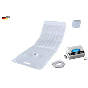 silnik Siemens nisko szumowy. Dane techniczne: samo gasnące antystatyczne tworzywo, klasa V0 i V2 zasilanie 230V/50Hz moc turbiny 75W do 900 W sterowana komputerowo (również pilotem) podgrzewanie wody 275 W maksymalna moc 1175 W ozonowanie włączane komputerowo (również pilotem) stężenie ozonu 0,03- 0,06 ppm przepływ powietrza od 750 do 9000 l/min sterowany komputerowo (również pilotem) czas zabiegu od 5 do 30 min sterowany komputerowo (również pilotem) nie wywołuje zakłóceń RTV ciśnienie wyjściowe 120 – 220 mb nie wymaga uziemienia podwójna ochrona izolacyjna stopień zabezpieczenia przed wilgocią: strugo szczelny waga urządzenia: 3,2 kg zasięg pilota (wodoszczelny) 5 m długość węża łączącego 3 m Funkcje terapeutyczne maty Normal stopy - staw skokowy,masaż receptorów (akupresura); łydki - mięśnie podudzia, ścięgno Achillesa; stawy kolanowe - więzadła podkolanowe; stawy biodrowe - nerw kulszowy; kości krzyża - napięcia mięśniowe (długotrwała pozycja siedząca); gorset mięśniowy grzbietu - lędźwi, boczne mięśnie tułowia; kręgosłup - więzadła międzykręgowe (zwyrodnienia), mięśnie przykręgosłupowe (odpowiedzialne za prawidłową anatomiczną pozycję); obręcz barkowa - napięcia między-łopatkowe (zastrzały); szyja - odcinek ścięgna głównego (bóle głowy); aparat ruchu - osteoporoza, reumatyzm, artretyzm, bóle stawów.