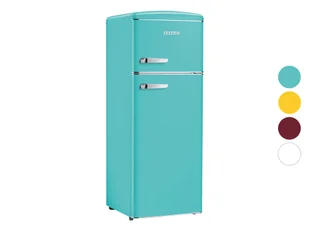 Severin Lodówka z zamrażarką w stylu retro Opis produktu Atrakcyjny wygląd w stylowym retro designie Wysokiej jakości design dzięki chromowanym metalowym uchwytom drzwi, szklanym ramom, półkom i osłonom drzwi Nowoczesne oświetlenie LED wewnątrz zapewnia przyjemne, jasne światło i doskonały przegląd Połączony regulator temperatury przy lampie 4 x regulowane w wysokości półki ze szkła bezpiecznego 3 x półki w drzwiach Regulowane nóżki Charakterystyka produktu table{width:100%;}td{padding-right: 30px; padding: 0.5rem; border-bottom: 0.0625rem solid #e3e4e5;} tr: nth-child(odd) {background-color: #F2F3F4;} Wymiary: ok. 144 x 55 x 57,5 cm (wys. x szer. x gł.) Kolory: niebieski, żółty; czerwony, biały Wyświetlacz: nie W zestawie: