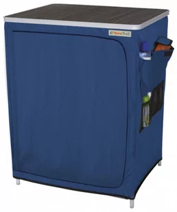 Ta niebieska szafka turystyczna Vallou marki Eurotrail stanowi znakomity mebel na kemping. Szafkę wykonano z poliestru, aluminium i MDF (blat). Zawiera mnóstwo przegród oraz składaną ramę wewnętrzną. Przestronna część dolna zmieści skrzynkę na butelki, a górna zapewnia wystarczającą ilość przestrzeni na Twoją kuchenkę i inne wyposażenie turystyczne, zapewniając przyjemny czas na kempingu. Dostawa zawiera torbę do przenoszenia.