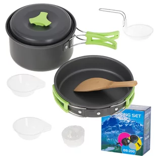 Dlatego nawet podczas biwaku, wypraw survivalowych czy wspinaczek górskich nie powinniśmy o nich zapominać. Ale jak w takich warunkach przygotować wartościowy, ciepły posiłek? Używając zestawu naczyń turystycznych! Duża ilość elementów niezbędnych do gotowania Zestaw składający się z garnka, patelni i innych licznych akcesoriów pomoże szybko i sprawnie podgrzać wodę czy przygotować pyszny posiłek na łonie natury! Patelnia, garnek i pokrywka wykonane są z aluminium, dzięki czemu dobrze przewodzą ciepło i przygotowanie jedzenia nie zajmie dużo czasu. W zestawie znajdują się również dwie miseczki do podzielenia się przygotowanym posiłkiem, drewniana łopatka do mieszania rzeczy oraz chochla do nakładania posiłków. Po skończonym posiłki, wszystkie elementy zestawu można wygodnie umyć, używając dołączonego zmywaka – wszystkie przyrządy będą raz-dwa gotowe na kolejne gotowanie! Dla ułatwienia gotowania w garnku znajduje się praktyczna miarka na ściance, tak abyś odmierzanie odpowiedniej ilości składników było szybkie i sprawne! Garnek, jak i patelnia mają składane rączki, dzięki czemu, gdy przyrządy są gorące, możesz je wygodnie trzymać. A gdy pora wyruszać w dalszą trasę, rączki wystarczy złożyć, a produkty zajmą mniej miejsca.