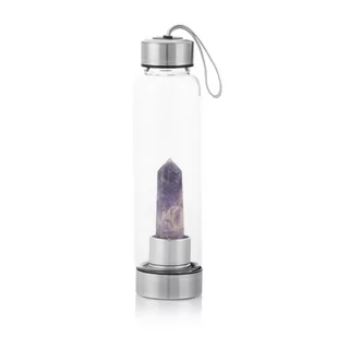 Szklana butelka na wodę z naturalnym kamieniem. Materiał: stal szlachetna, szkło, kamień naturalny Kamień: Ametyst Wymiar: 6,6 cm x 24 cm Pojemność: 500 ml Opakowanie: