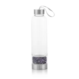 Szklana butelka na wodę z naturalnym kamieniem. Materiał: stal szlachetna, szkło, kamień naturalny Kamień: Ametyst Wymiar: 6,6 cm x 24 cm Pojemność: 500 ml Opakowanie: