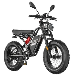 20×5.0-inch puncture-resistant fat tires for superior traction on all terrains. Hydraulic suspension with 100mm travel absorbs shocks for ultimate comfort. Upgraded rear shock absorber with 100mm travel for improved cushioning on rough roads. Extended bench seat accommodates two riders comfortably. This setup ensures both comfort and compliance for high-speed e-bike use under EU regulations.