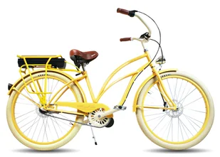 Damski model elektryczny e-bike Sunrise dla niepowtarzalnych kobiet! Rama damska stalowa 20″ w kolorze żółto-pomarańczowym elementy metalowe malowane proszko...
