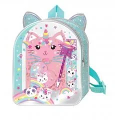 notatnik z czystymi karteczkami- mini-notatnik na drobne zapiski- długopis z ozdobną nakładką - arkusz naklejek Zestaw zapakowany w plecaczek z brokatem i regulowanymi paskami Wiek: