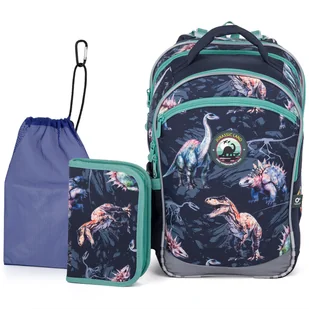 Zestaw szkolny składający się z plecaka, piórnika i worka. Komplet szkolny składa się z produktów: COCO 25016 - Plecak szkolny Dinozaury, PENN 25016 - Piórnik szkolny z dwoma skrzydłami, ZUZA 19046 - Worek na obuwie