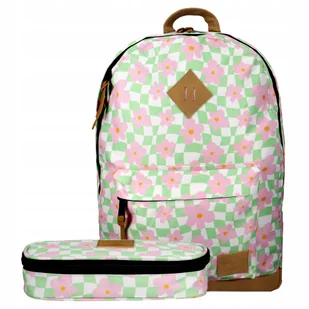 Zestaw plecak szkolny młodzieżowy szachownica kwiatki pastel miętowy kratka