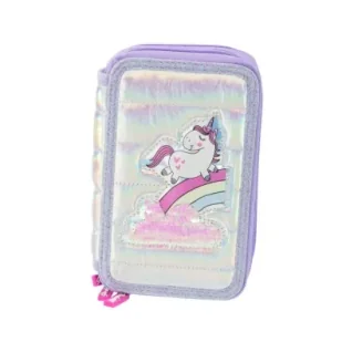 Piórnik posiada trzy przedziały, z zamkami błyskawicznymi, pokrytymi miękką, opalizującą, wodoodporną tkaniną ozdobioną jednorożcem z odwracalnymi cekinami. Idealny do szkoły i zajęć. Piórnik zawiera: 2 długopisy, 1 linijka, 1 guma, 1 ostrzałka, 16 markerów i 16 kolorowych ołówków.
