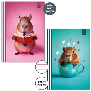 Bee-bee Zeszyt A5 Kapibara trzy linie 32 kartki 10 szt. . Opakowanie zbiorcze mix wzorów 10sztZeszyt formatu A5, okładka folia soft touchlakier wybiórczy32 kartki, papier 90gm2kolorowe wzornictwo i w zależności od modelu zdobienie przy pomocy lakieru wybiórczegokolory przedstawione na zdjęciu mogą. . .