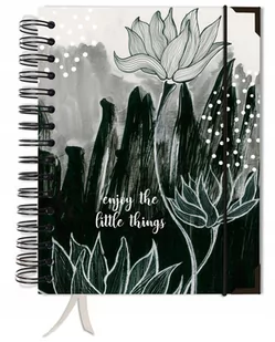 180 ✔️ Strony: numerowane, delikatnie kropkowane co 5 mm ✔️ Papier: delikatnie kremowy, ekologiczny (matt, 120g/m²) ✔️ Okładka: twarda ✔️ Dodatki: zakładka wstążkowa, gumka, która nie pozwoli otworzyć się kalendarzowi w nieoczekiwanym momencie, koperta/kieszonka z tyłu planera na wszystkie luźne notatki, małe dokumenty, naklejki lub rachunki, metalowe ochraniacze zabezpieczające narożniki Wyjątkowy TaDaPlanner ✴ 1 - twarda okładka na spirali dopasowanej kolorystycznie do wzoru okładki ✴ 2 - zakładka wstążkowa ✴ 3 - gumka, która nie pozwoli otworzyć się kalendarzowi w nieoczekiwanym momenci.