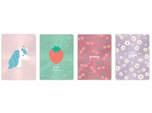Format: A5. Liczba kartek: 32. Zadruk w kolorową trzylinię. Zaokrąglone rogi. Okładka z modnym efektem srebrnej metalizy. Mix wzorów. Towar wysyłany losowo.