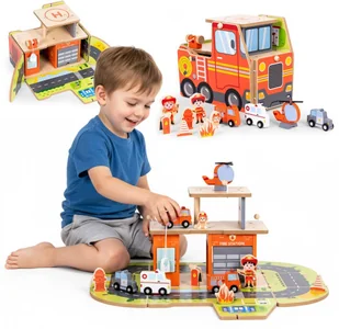 DREWNIANY GARAŻ ZESTAW STRAŻY POŻARNEJ 2W1 - REMIZA I WÓZ 2 PIĘTRA FIGURKI
