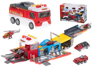 Duży transportowiec w postaci wozu strażackiego, który na swoim pokładzie może przetransportować dołączone do zestawu auta.