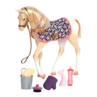 30cm - okrycie/ derka - halter z lonżą - szczotka - wiaderko - gąbka - butelka z atomizerem - szampon - rękawica do czesania Zabawka wolna od FTALANÓW i BPA (Bisfenolu A). Przeznaczona dla dzieci w wieku od lat 3. Całość w otwartym kartonie o wielkości 35cm x 32cm x 13cm z atrakcyjną grafiką, od wewnątrz imitującą słomę i siano, na której stoi koń.