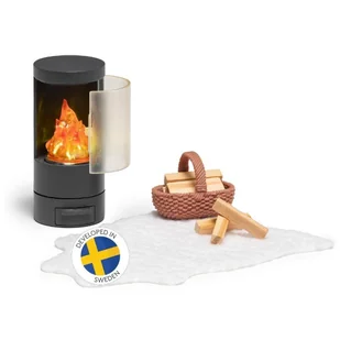 Zawiera piękny czarny kominek, który ma otwierane drzwiczki i popielnik, a wewnątrz jest ogień z prawdziwym oświetleniem LED z wbudowanym timerem; dywanik imitujący owczą skórę oraz koszyczek i 4 klocki drewna opałowego. Oświetlenie włącza się jednym kliknięciem, a po 15 minutach wyłączy się automatycznie.