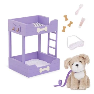 Łóżko piętrowe z pieskiem i akcesoriami Pup Bunks Our Generation Zestaw Pup Bunks od Our Generation to prawdziwa gratka dla każdej dziewczynki, która marzy o tym, by opiekować się swoimi lalkami i ich pupilami. Łóżko piętrowe z pieskiem to świetna okazja do wprowadzenia w świat zabawy z opieką nad zwierzętami. Dwa wygodne materace sprawiają, że pluszowe pieski będą mieli swoje miejsce do odpoczynku, a dodatkowe akcesoria wzbogacą zabawę o wiele godzin kreatywnej radości. Zestaw zawiera wszystko, czego potrzebujesz, by zadbać o swojego pupila: pluszowego pieska, obrożę ze smyczą, opaskę na oczy, 3 psie ciasteczka, szczoteczkę z pastą do zębów.