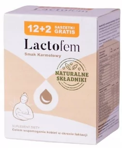 Lactofem 14 saszetek Lactofem to produkt przeznaczony dla kobiet w okresie laktacji. Produkt dostarcza specjalnych wyselekcjonowanych składników odżywczych właściwych dla odżywiania organizmu kobiety karmiącej. Stosowanie produktu na bazie słodu jęczmiennego jest przykładem dobrej praktyki postępowania dietetycznego wspierającego laktację. Dodatkowo Lactofem został wzbogacony o cholinę oraz składniki odżywcze, takie jak: kwas foliowy, witaminy B6 i B12, które odżywiając organizm kobiety przechodzą̨ do mleka kobiecego wpływając na jego jakość i wartość odżywczą dla dziecka.
