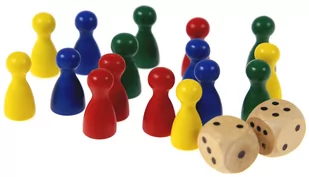 Zestaw kolorowych, drewnianych pionków oraz kostek do gier. Kombinacja w sam raz do gry w klasycznego "chińczyka" oraz inne gry planszowe.
