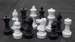 Mały zestaw szachów ogrodowych (król 30 cm) Sunrise Chess & Games Mały zestaw szachów ogrodowych, idealny do szkół, hoteli oraz na imprezy integracyjne. Wysokość najwyższej figury czyli króla wynosi 30 cm. Wykonane z tworzywa odpornego na ciepło, zimno i żywioły. Zestaw składa się z 32 figur w kolorze czarno-białym, zapewniających doskonałą widoczność figur. Szachy są łatwe do przenoszenia, ponieważ są lekkie.