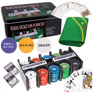 ZESTAW DO POKERA Zestaw do gry w pokera, to idealna opcja dla miłośników oraz amatorów ten popularnej rozgrywki. Zestaw jest kompletny i zawiera aż 200 żetonów dlatego pozwala na znacznie więcej niż mniejsze zestawy. Mata do pokera przeznaczona dla aż 6 osób jednocześnie żetony funkcyjne DEALER, BIG BLIND, SMALL BLIND 2 komplety talii kart do gry stelaż na żetony w zestawie zielona mata do gry trwałe metalowe pudełko świetny pomysł na prezent ZESTAW DO POKERA TEXAS Fantastyczny kompletny zestaw do gry w Texas hold'em poker i inne gry karciane. Wszystko czego potrzebujesz by poczuć się jak w prawdziwym kasynie. Idealnie nadaje się do gry w pokera i inne gry np.
