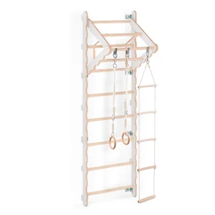 Drabinka naścienna do pokoju dziecka | Drabinka do wspinaczki (200 cm) z uchwytem do podciągania i drabinką linową Yarnwood | Obręcze gimnastyczne