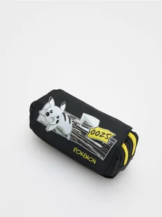 Piórnik o prostej formie, wykonany z tkaniny z nadrukiem.
