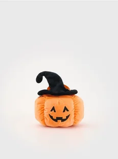 Poduszka w kształcie dyni z motywem halloween, z rozpinaną górą i dodatkowymi zabawkami wewnątrz.
