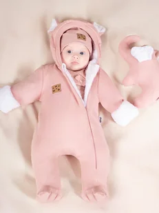 Pajac ocieplany wykonany z zewnątrz z bawełny dresowej w kolorze pudrowego różu z naszywką z przodu. Podszyty futerkiem w kolorze białym, co sprawia, że ubranko idealnie nadaje się na chłodne dni. Całość zdobi kaptur z uszkami. Ubranko posiada zawijane rękawy aby na dworze ochronić rączki dziecka przed zimnem. Materiał jest całkowicie bezpieczny dla skóry dziecka.