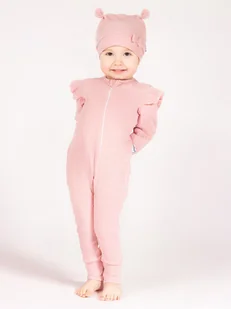 Pajacyk na zamek z długim rękawem, wykonany z prążkowanej bawełny z niewielką ilością elastanu w kolorze pudrowego różu. Posiada ozdobne motylki przy rękawac...
