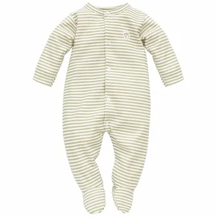 Prosty chłopięcy pajacyk z naszywką z pieskiem, wykonany jest z czystej bawełny w kolorze écru, drukowanej w oliwkowe paseczki, kolorystycznie pasujące do ko...