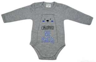 Body niemowlęce CHŁOPAKI NIE PŁACZĄ szary melanż 6868 Body z nadrukiem w pięknych, żywych kolorach uszyte z bawełny. Sprawdzą się świetnie na każdy dzień oraz na wyjątkowe okazje. Są miękkie, delikatne i przyjemne w dotyku. Bawełna, z której zostały uszyte, jest w 100% bezpieczna dla wrażliwej skóry Twojego maluszka. Z troski o Twoje maleństwo szyjemy ubranka, które: