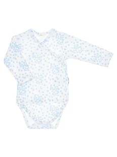 Body kopertowe z długim rękawem dla dziewczynki, uszyte z białej bawełny w niebieskie kwiatuszki. Materiał posiada certyfikat Oeko-Tex Standard 100 Tekstylia...