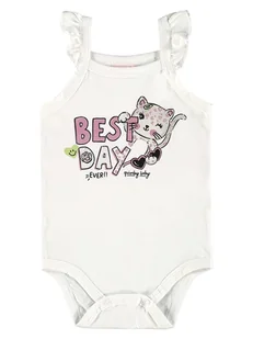 Białe body dziecięce z cienkimi ramiączkami to uroczy wybór na ciepłe dni. Wykonane z delikatnego materiału, zapewniającego komfort noszenia, body ma subtelny nadruk kotka, który dodaje mu uroku. Idealne dla maluchów, zapewnia swobodę ruchów i pasuje do różnych stylizacji. Dzięki prostemu, ale eleganckiemu designowi, jest to doskonały element garderoby dla każdego dziecka.