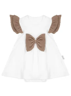 Wyprodukowano w Polsce Eleganckie sukienko-body dla dziewczynki wykonane z białej bawełny. Elementy ozdobne to duża brązowa, prążkowana kokarda oraz podwójne...