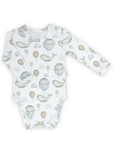 Wyprodukowano w Polsce Body z długim rękawem dla chłopca, uszyte ze 100% bawełny drukowanej w wieloryby i balony. Materiał posiada certyfikat Oeko-Tex Standard 100 Tekstylia godne zaufania. Produkt zapinany na ramieniu i w kroku na bezniklowe napy, zapewniając komfort przy ubieraniu.