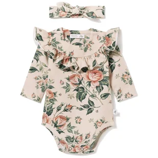 Zestaw body z falbanką i opaska z supełkiem, róże na beżu 62