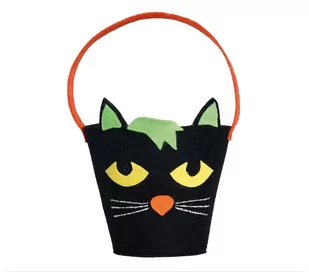 Koszyk filcowy do zbierania słodyczy podczas Halloween lub do trzymania słodyczy, które chcemy rozdać dzieciom. Torba jest w kolorze czarnym z jednostronną naklejoną aplikacją z filcu, która imituje wygląd głowy kotka z żółtymi oczyma. Koszyczek posiada pomarańczowy uchwyt ułatwiający noszenie go. Koszyk z powodzeniem posłuży także jako osłonka dekoracyjna doniczki lub pojemnika podczas Halloween.