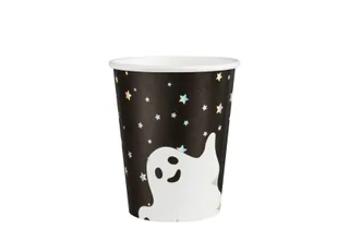Papierowe kubeczki w kolorze czarnym z nadrukiem ducha oraz opalizujących gwiazdek.