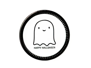 Talerzyki papierowe z nadrukiem na halloween. Na talerzykach znajduje się nadruk wesołego duszka. Średnica: 18 cm. Opakowanie: 6 szt.